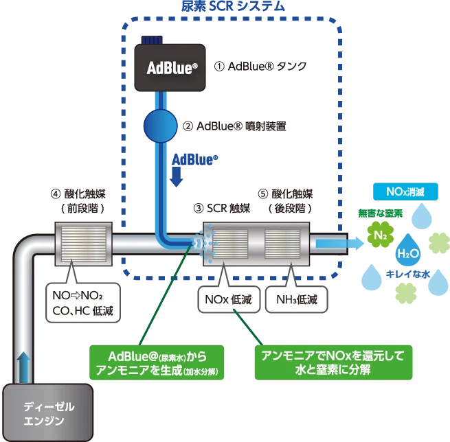 排気ガス中の窒素酸化物(NOx)に対してマフラー内でAdBlue®(尿素水)を噴射する事により高温下で加水分解されたアンモニアガスが窒素酸化物(NOx)を無害な窒素(N₂)と水(H₂O)に分解し環境と共に人体への影響を優しくするためのシステムです。