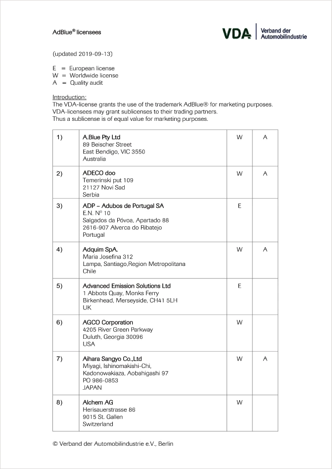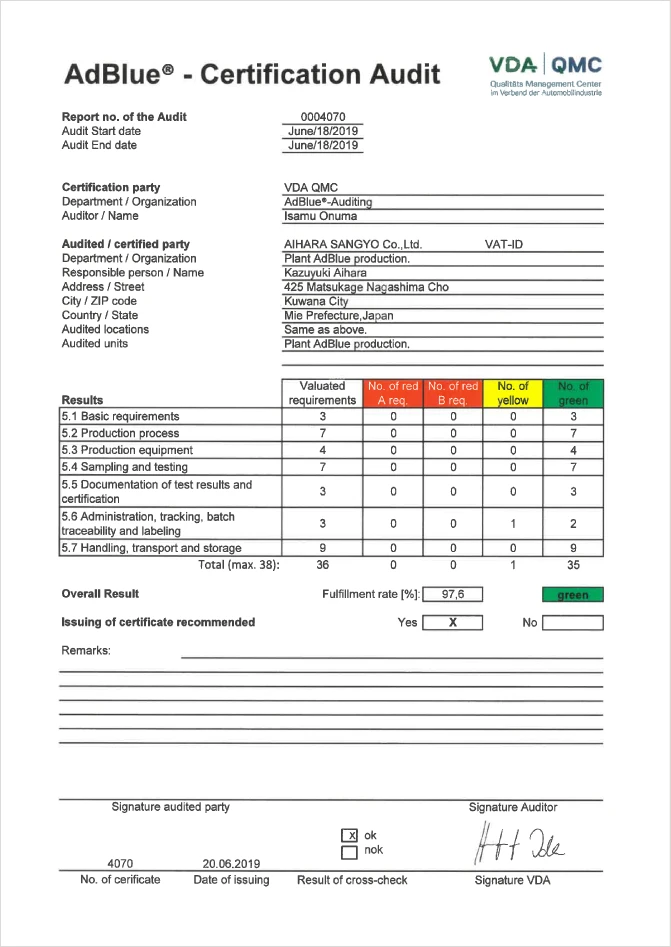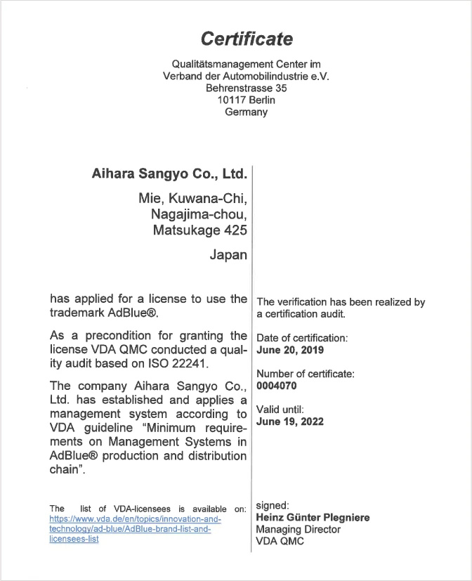 弊社のAdBlue®を製造しております株式会社相原産業は、ドイツ自動車工業会(VDA)の監査、検体検査を経て、認証を受けております。認証の確認は、ドイツ自動車工業会(VDA)のホームページのパートナーリストでご確認いただけます。